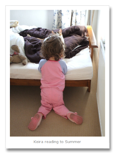 Keira certainly woke up with a lot of energy this morning! Here is a picture of her reading to Summer. I thought it was the cutest thing. Keira thinks Summer is her friend and she was so excited to be coming to visit "Teev" and "Summa" this weekend! Summer just loves the attention.